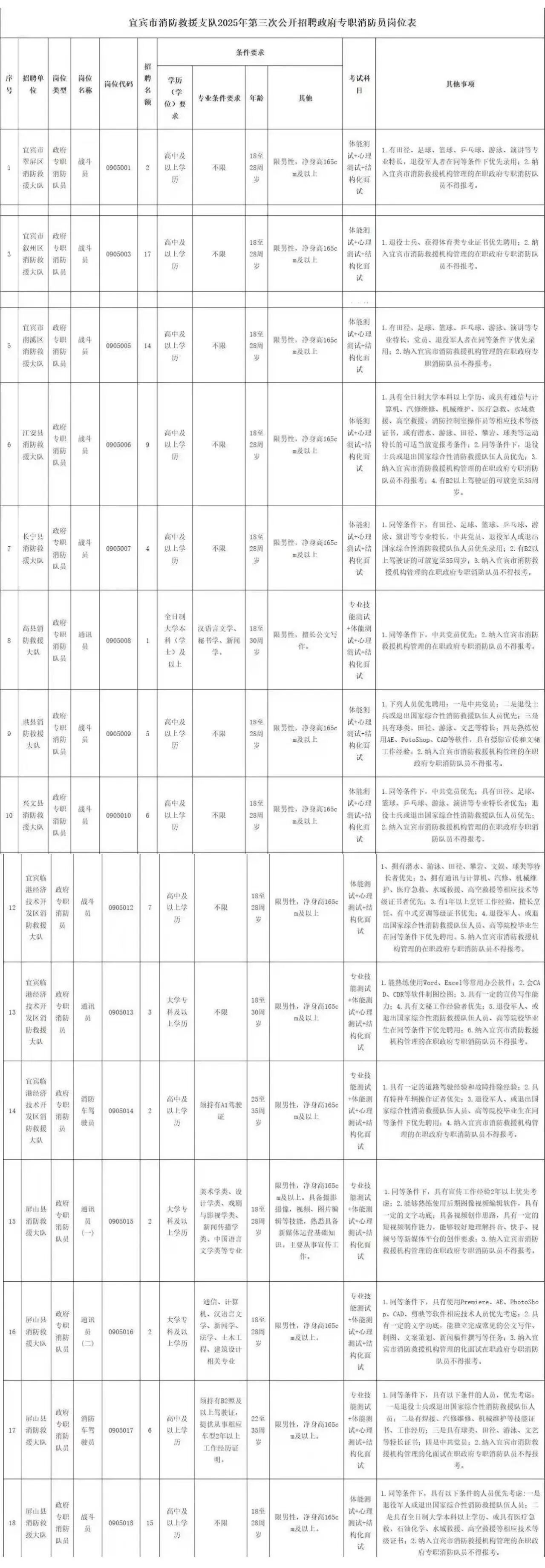 附件一:宜宾市消防救援支队2025年第三次政府专职消防员招聘岗位表